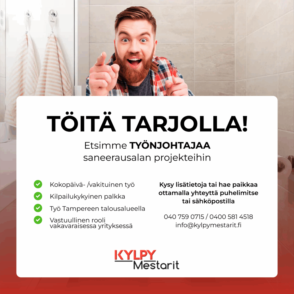 Haemme työnjohtajaa saneerausalan projekteihin ja tarjoamme vakituisen työpaikan vakavaraisessa yrityksessä. Laita hakemus sähköpostissa osoitteeseen info@kylpymestarit.fi tai soita meille 040 759 0715 / 0400 581 4518